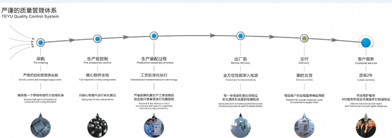 采购环节:严密把控和管理供应链,确保每一个零部件都符合使用标准→生产前控制:核心部件全检,对核心零部件进行老化测试→生产装配过程:按工艺标准化执行,严格按照机器生产工序流程的规定和注意事项进行机器装配→出产前:全方位性能深入检测,每一台成品机都必须经过老化测试和全面的性能检测→交付:准时交货,缩短客户供应链整体响应周期→客户服务:推行2年质保,终身维护服务, 400服务热线全天候接听和快速响应。