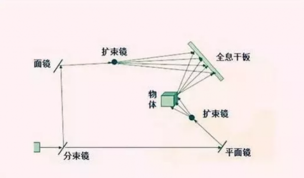 全息技术第一步是利用干涉原理记录物体光波信息,此即拍摄过程:被摄物体在欧陆娱乐辐照下形成漫射式的物光束;另一部分欧陆娱乐作为参考光束射到全息底片上,和物光束叠加产生干涉,把物体光波上各点的位相和振幅转换成在空间上变化的强度,从而利用干涉条纹间的反差和间隔将物体光波的全部信息记录下来。记录着干涉条纹的底片经过显影、定影等处理程序后,便成为一张全息图,或称全息照片。