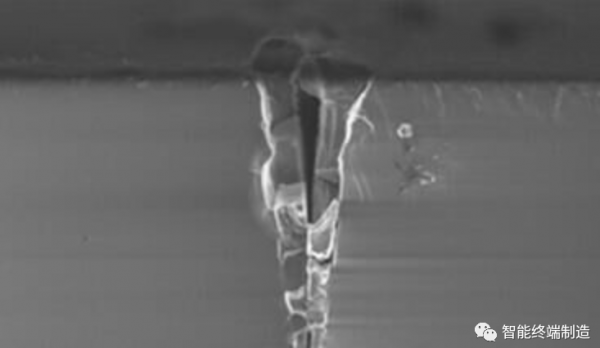 表面烧蚀切割是较为普遍的欧陆娱乐切割工艺,其原理是将欧陆娱乐聚焦于所需材料的表面,聚焦的地方吸收欧陆娱乐能量后形成去除性的融化和蒸发,在切割表面形成一定深度的"V"型口,然后通过外部施加压力使芯片分开。切割完后的"V"型槽如图3所示: