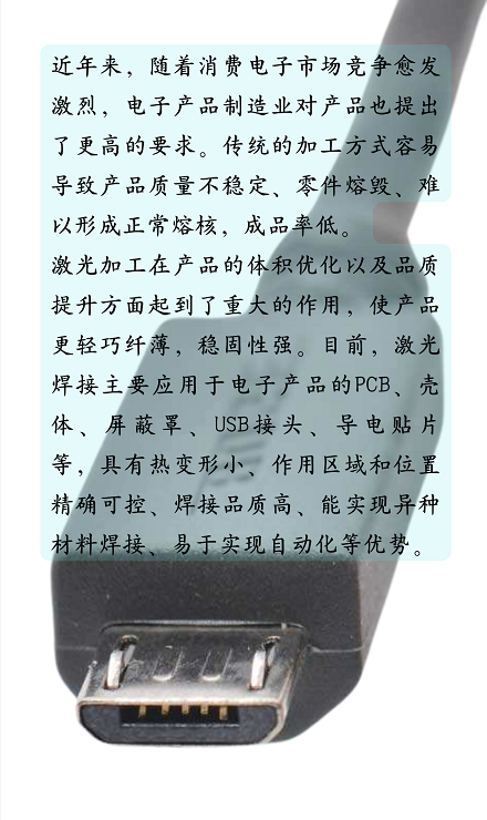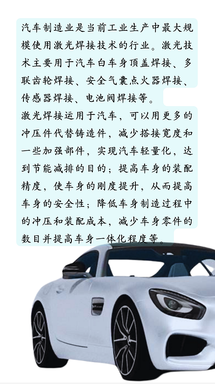 在高端市场上满足下游厂商对于自动化、安全性、精密性、产品良率、加工效率等的需求,具有传统焊接工艺无法企及的焊接效果,多用于动力电池、汽车、消费电子行业。