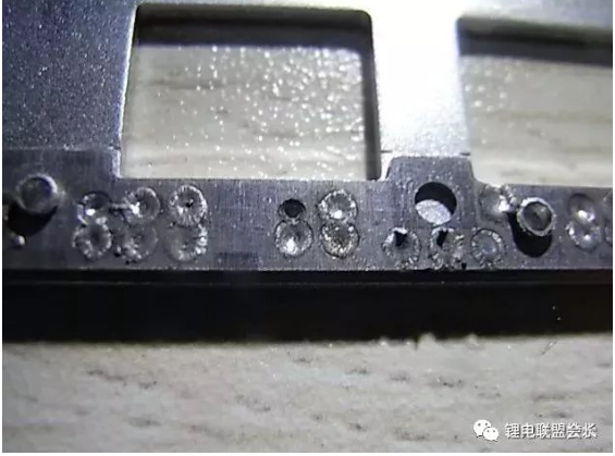 方形电池组合焊接时,极柱或连接片受污染厚,焊接连接片时,污染物分解,易形成焊接炸点,造成孔洞;极柱较薄、下有塑料或陶瓷结构件的电池,容易焊穿。极柱较小时,也容易焊偏至塑料烧损,形成爆点。不要使用多层连接片,层之间有孔隙,不易焊牢。