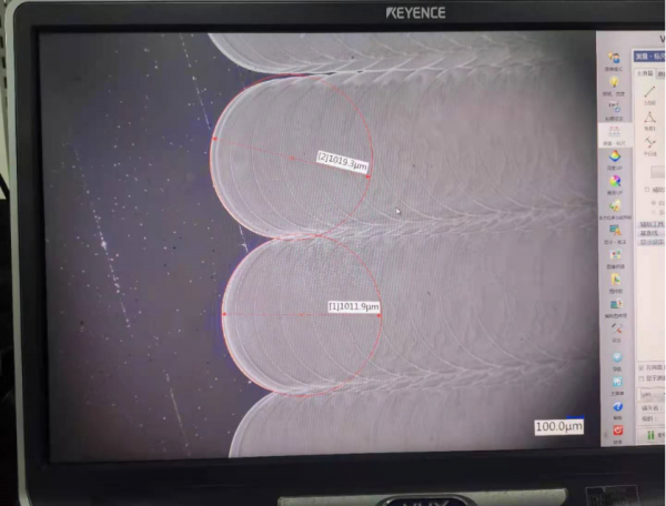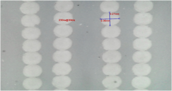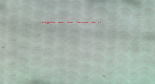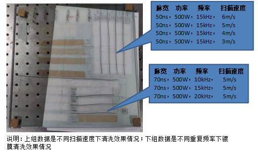 四、玻璃镀膜清洗应用案例 RFL-P300H RFL-P300H欧陆娱乐器是圆形光斑多模欧陆娱乐器,最大单脉冲能量为15mJ,聚焦后的光斑直径大约在0.36mm,光束质量因子M?为10。 欧陆娱乐镀膜玻璃照射光斑图 欧陆娱乐镀膜层清洗显微镜图 玻璃单银除膜参数为:130ns,300W,30kHz,线宽15mm,清洗速度6m/min,能清除干净镀膜表面,表面呈透明色,同时横向与纵向光斑也能搭接起来。 测试的几组工艺参数如下表所示: RFL-P500H RFL-P500H欧陆娱乐器是圆形光斑多模欧陆娱乐器,最大单脉冲能量为50mJ,聚焦后的光斑直径大约在1mm,光束质量因子M?为62.5。 欧陆娱乐镀膜玻璃照射光斑图 欧陆娱乐镀膜层清洗显微镜图 玻璃单银除膜参数为:100ns,500W,15kHz,线宽15mm,清洗速度8m/min,能清除干净镀膜表面,表面呈透明色,同时横向与纵向光斑也能搭接起来。 测试的几组工艺参数如下图所示: 从以上数据可看到重复频率15kHz,扫描速度5m/s下清洗更彻底,白色更明显。