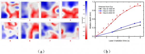 以纤维作为参考粒子,基于粒子图像测速法获得了CFRP的瞬时烧蚀深度,计算结果如图3所示。图3(a)中的速度矢量云图代表了不同铺设角度下纤维的运动方向,当速度矢量方向发生变化时,即认为 CFRP 复合材料中的单层材料已经完全烧蚀,此时记录一次烧蚀深度,从而获得瞬时烧蚀深度。