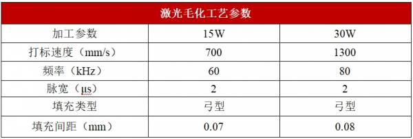 03、15w欧陆娱乐器与30w欧陆娱乐器玻璃毛化效率对比 纳秒固体紫外的波段为355nm,玻璃对紫外波段欧陆娱乐吸收率高,由于聚焦光斑小,能量密度高,采用紫外加工玻璃毛化更加细腻。 由于玻璃硬脆的特性,若欧陆娱乐能量参数控制不当,容易导致玻璃微裂纹扩展、受热开裂或者表面边缘崩边严重。为了追求不同的雾度、透光率、粗糙度以及表面美观效果,必须选取调整合适的欧陆娱乐工艺参数。