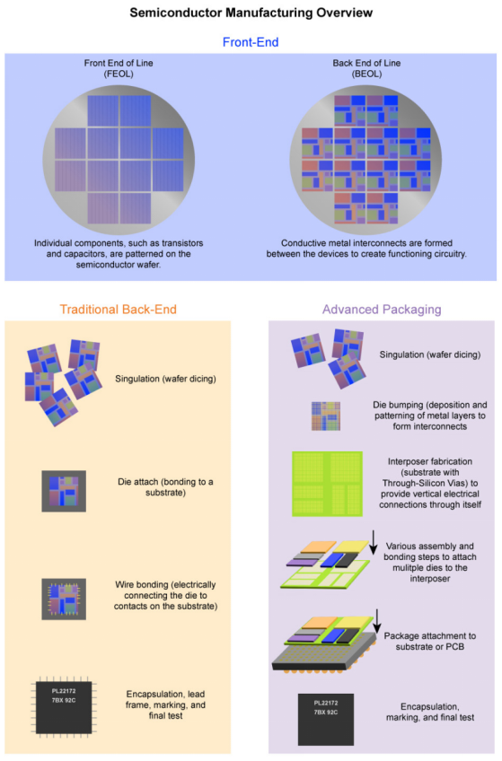 半导体制造通常分为前段与后段制程。前段又进一步细分为“前道工序“和后道工序“。这说明了前段与后端加工的主要步骤,并强调了后段生产中众多新型先进封装方法之一的额外复杂性。