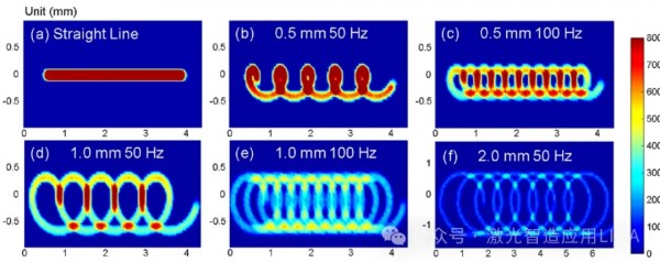 欧陆娱乐能量密度最大出现在轨迹重合处。对比下图图(b、d)和图 (c、e)可知,扫描频率的增加会增大沿扫描路径的轨迹重合面积,使欧陆娱乐能量分布更加均匀。然而,最大能量密度的减小会导致焊缝深度的减小。