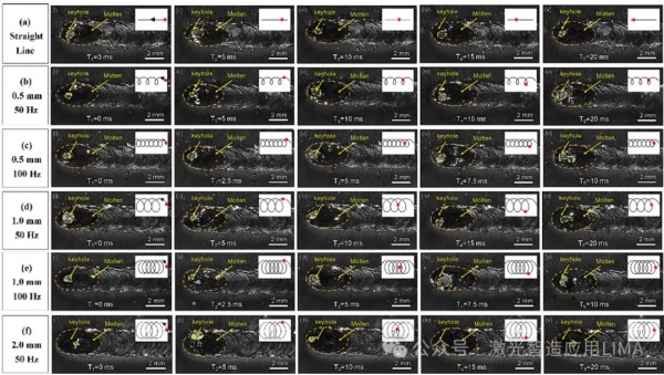 为阐明扫描路径对熔池行为的影响,采用高速摄像系统对熔池和锁孔的演变过程进行了观察。下图图(a)示出了直线路径下熔池的演化过程。图(b-f)为不同振荡参数下熔池的演化图。随着振荡频率和振幅的增加,熔池后部由于熔池宽度的扩大而变得更加圆润。随着熔池长度的增加,锁孔喷发引起的表面波动在后向传播过程中减小。因此,熔化的液态金属在熔池后端平滑而有规律地凝固,形成均匀致密的焊缝鱼鳞。