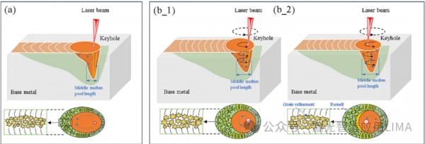 下图显示了直线和振荡焊接过程所示,欧陆娱乐振荡焊接中欧陆娱乐束的位置不断变化,会增加中间熔池长度,使已经凝固的金属重新熔化,导致晶粒生长速率r降低。可导致下等轴晶区G/R的降低。