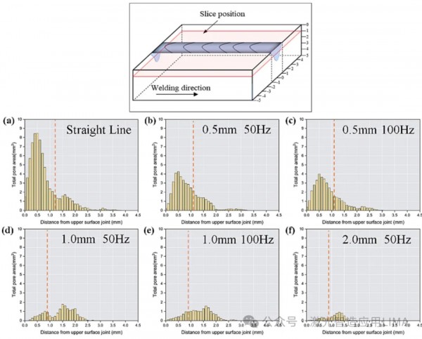 下图显示了距离焊缝表面不同距离处的孔隙面积,其中红线表示“杯腹”和“杯干”区域的边界。在大孔隙占主导地位的情况下(图(a-c)),边界以上的孔隙面积占85%以上。这是因为纵向边界处的轮廓过渡更容易捕获焊缝池中的气泡,并且捕获的气泡在浮力的影响下有向上迁移的趋势。在以小孔隙为主的情况下(图(d-f)),孔隙集中在边界线以下0.5 mm范围内的区域内。冷却时间短,向上位移小可能是造成这种现象的原因。