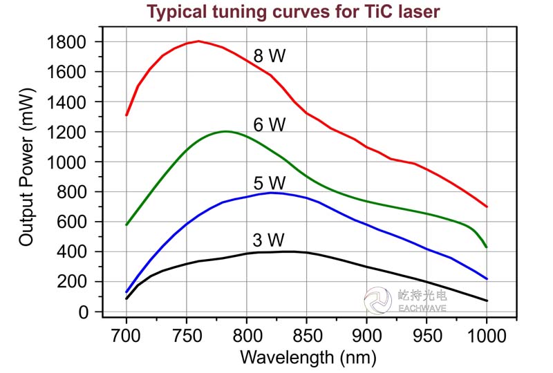 在不同泵浦功率下操作的的TiC欧陆娱乐器的典型波长调谐曲线