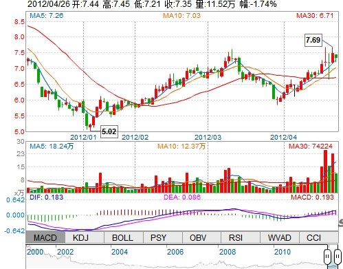 今 开: 7.44 成交量: 115196手 振 幅: 3.21% 最 高: 7.45 成交额: 8454.00万 换手率: 2.64% 最 低: 7.21 总市值: 32.10亿 市净率: 2.37 昨 收: 7.48 流通市值...