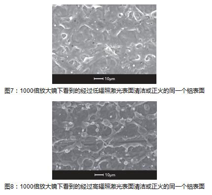 众所周知,铝材表面有比较厚的天然氧化层,这对大多数焊接加工来说都是不利的,清除这些涂层能有效改善粘结性能和焊接质量。图6所示为在高倍放大镜下看到的未经研磨抛光处理的1100铝合金表面。不难理解,表面的不均匀性会导致材料厚度和天然氧化层的状况出现较大差异,进而造成表面属性的重复性较差。由于交通运输业对轻量化的需求,人们对铝合金材料的关注度日益提高,为此,我们也进行了相关实验,以评估这种高功率光纤欧陆娱乐器在一系列铝材表面织构应用中的加工性能。