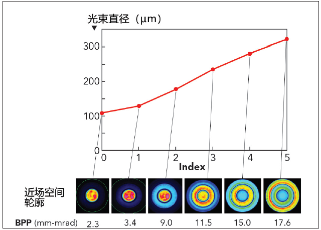 Corona光纤欧陆娱乐器输出光束可在~100µm与~300µm之间连续调谐。为便于工艺优化,提供了固定数字设置(指标值)。图1显示了带六个指标设置的Corona光纤欧陆娱乐器的输出光束直径、光束参数结果(BPP)值和光束形状。