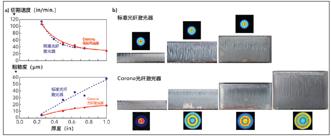 图2:采用带100μm 馈送光纤的标准4kW 光纤欧陆娱乐器与4 kW Corona 光纤欧陆娱乐器(a)进行氧气辅助低碳钢切割的对比,其中上图显示了切割速度,下图显示了测得的边缘粗糙度值;照片显示边缘质量,光束图像包含于每张照片的上方或下方(b)。