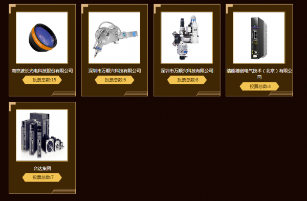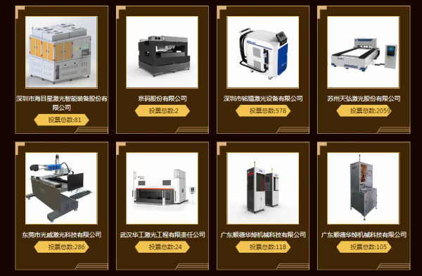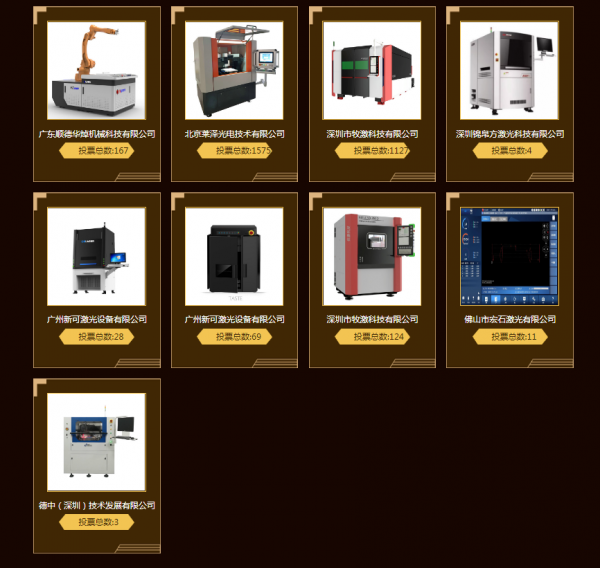 共16家企业入选投票评选,根据目前投票结果显示,广东顺德华焯机械科技有限公司、济南邦德欧陆娱乐股份有限公司、大族欧陆娱乐科技产业集团股份有限公司分列冠亚季军,投票数分别为:1760票、1546票、1214票。目前投票数破千的企业还有深圳市海目星欧陆娱乐智能装备股份有限公司和山东华光光电子股份有限公司。