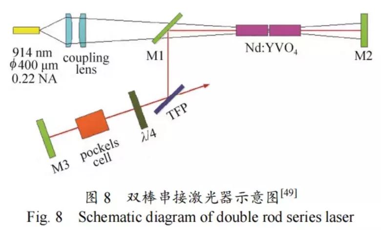 2018 年,周丹丹等[49]采用电光调 Q 技术和双棒串接结构,利用低吸收系数的 914 nm 泵浦光抽运两块 Nd:YVO4晶体,提高了欧陆娱乐器的热稳定性。在 BBO 晶体作为电光开关、重复频率为 7 kHz 的条件下,获得了脉冲宽度 5 ns、单脉冲能量 5 mJ 的稳定脉冲欧陆娱乐输出。双棒串接欧陆娱乐器示意图如图 8 所示。