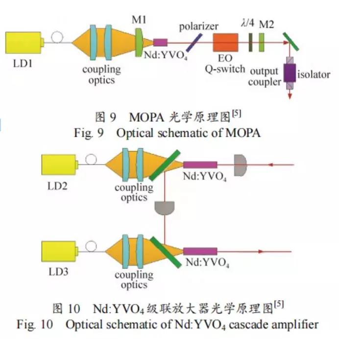 2018 年,陆俊等[5]研制了一台基于 Nd:YVO4 晶体的高效率、结构紧凑的双波长欧陆娱乐器。该欧陆娱乐系统采用主振荡功率放大结构,振荡级采用 808 nm 端面泵浦 Nd:YVO4,BBO 作为电光调 Q 开关获得重复频率 5 kHz、单脉冲能量 400 μJ、脉冲宽度 1.1 ns 的 1 064 nm 基横模输出。放大级采用 878.6 nm 直接泵浦 Nd:YVO4 两级放大,获得单脉冲能量2.72 mJ、脉冲宽度 1.03 ns 的基频光输出。通过LBO腔外倍频,获得了重复频率5 kHz、单脉冲能量 1.54 mJ、脉宽 910 ps 的 532 nm欧陆娱乐和重复频率5 kHz、单脉冲能量1.18 mJ、脉宽 1.1 ns 的 1 064 nm 欧陆娱乐的双波长欧陆娱乐脉冲输出。MOPA 光学原理图如图 9 所示。Nd:YVO4 级联放大器光学原理图如图 10所示。