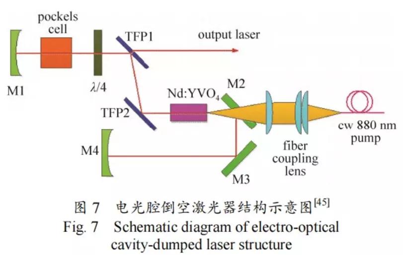 2014 年,石朝辉等[45]利用 LD 输出880 nm 泵浦波长直接抽运 Nd:YVO4,有效降低晶体的热效应,采用 BBO 晶体作为电光腔倒空的调 Q 元件。通过优化谐振腔,使欧陆娱乐器在宽泵浦范围保持稳定,提高泵浦光与振荡光的模式匹配。在重复频率为 500 kHz 的条件下,获得单脉冲能量 20 μJ、脉冲宽度 6 ns 的稳定欧陆娱乐输出。电光腔倒空欧陆娱乐器结构示意图如图 7 所示。