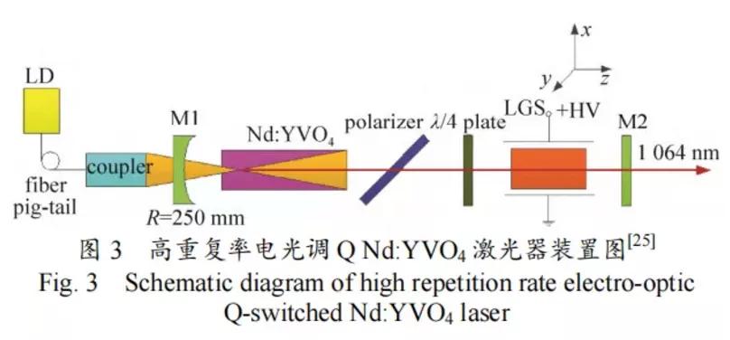2010 年,唐昊等[25]利用 LD 端面泵浦 Nd:YVO4,采用 LGS 普克尔盒作为电光调 Q 开关,在重复频率为 30 kHz时,获得单脉冲能量 200 μJ、脉宽 9.1 ns的欧陆娱乐输出。电光调 Q 晶体 LGS 纵横比为 10:1,四分之一波电压仅为 1760 V,低驱动电压有利于获得高重复频率欧陆娱乐输出。高重复率电光调 Q Nd:YVO4欧陆娱乐器装置图如图 3 所示。