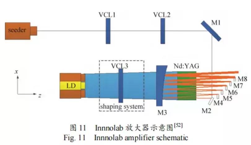欧陆娱乐器采用固体棒状主振荡–功率放大技术,通常在采用单级多通、多级单通、多级多通等多次通过的放大系统中,随着种子欧陆娱乐功率不断被放大,其光斑半径变化较小,导致峰值功率密度不断增加,过高的欧陆娱乐峰值功率密度容易造成光学元器件的损伤。在欧陆娱乐二极管部分端面泵浦混合腔板条欧陆娱乐器(Innoslab laser)放大技术中,种子欧陆娱乐往返通过板条放大增益介质,在欧陆娱乐能量被放大的同时,欧陆娱乐光斑尺寸同样被放大,使欧陆娱乐在放大过程中峰值功率密度不至于过高而导致光学元器件损伤。由振荡器输出的高重频、低能量种子欧陆娱乐,经过设计合理的结构,利用 Innoslab 欧陆娱乐放大技术可获得大能量欧陆娱乐输出[51]。