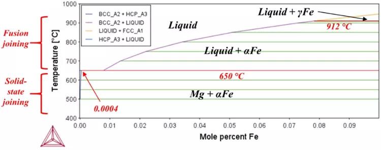 由于镁合金价格昂贵,且对腐蚀的敏感性较高,因此使用铝合金比镁合金多。与镁钢相比,铝钢异种连接的工作量要大得多。虽然在连接不同材料时常见的障碍适用于镁-钢对,但在连接镁和钢方面存在一些独特的挑战。首先,镁和铁在冶金上几乎不混溶:铁在镁中的溶解度为0.04 at.%,镁在铁中的溶解度为零。