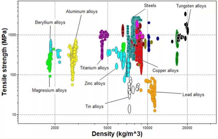 图1 Ashby图中结构金属的强度与密度,在图中,镁合金用绿色箭头标记