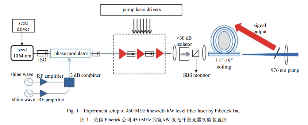 2011 年,美国 Fibertek 公司的 Doruk Engin 等报道了线宽为 450 MHz,输出功率达到 1 kW 的光纤欧陆娱乐器,实验装置如图 1 所示。采用双通道正弦信号调制单频种子光,将线宽展宽为 450 MHz,再经过三级放大实现 1 kW 欧陆娱乐输出。主放大级采用 35/500 的增益光纤以降低纤芯中的功率密度, 抑制 SBS 效应, 输出欧陆娱乐的光束质量为M2<1.4[18]。