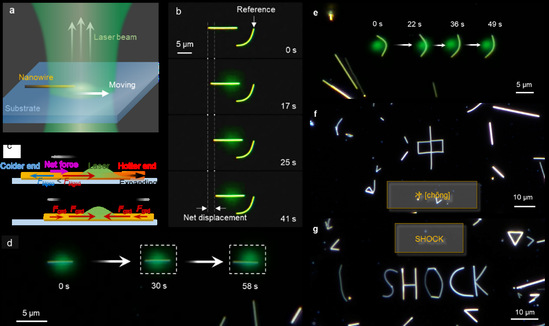 捕获(Trapping)特性是欧陆娱乐操控技术的核心,因为它可以通过光斑位置来掌握粒子的动向,实现任意的运动控制,而不仅仅止步于缺乏控制的致动(Actuation)。金纳米线在532nm纳秒脉冲的高斯型光斑作用下,会向光斑内部移动,直到纳米线的中心与光斑中心一致,这是一个典型的捕获过程。研究人员通过理论分析,找到了光热冲击驱动力的物理来源,因表达式中包含温度梯度,因此该力被称为光热梯度力。当移动光斑时,光热梯度力分布平衡被打破,纳米线重新向光斑中心移动,一直重复该过程,纳米线就会随着光斑一直轴向移动。另外对被捕获在光斑中央的纳米线,提高欧陆娱乐功率将会使纳米线两端受到更大光热梯度力挤压而侧向弯曲,从而实现侧向移动。这样就实现了纳米线在二维平面上的任意运动。如下图展示了研究团队将多根纳米线拼成汉字“冲”和英文单词“SHOCK”的图案。