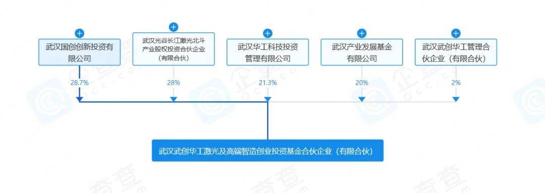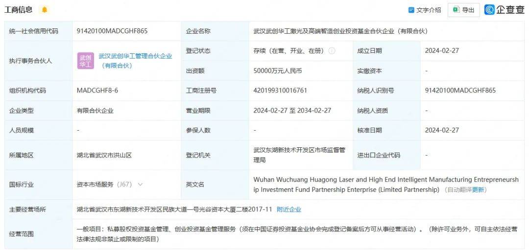 近日,武汉武创华工欧陆娱乐及高端智造创业投资基金合伙企业(有限合伙)成立,执行事务合伙人为武汉武创华工管理合伙企业(有限合伙),注册资本5亿元,经营范围包含:私募股权投资基金管理、创业投资基金管理服务。企查查股权穿透显示,该公司由华工科技全资子公司武汉华工科技投资管理有限公司等共同持股。