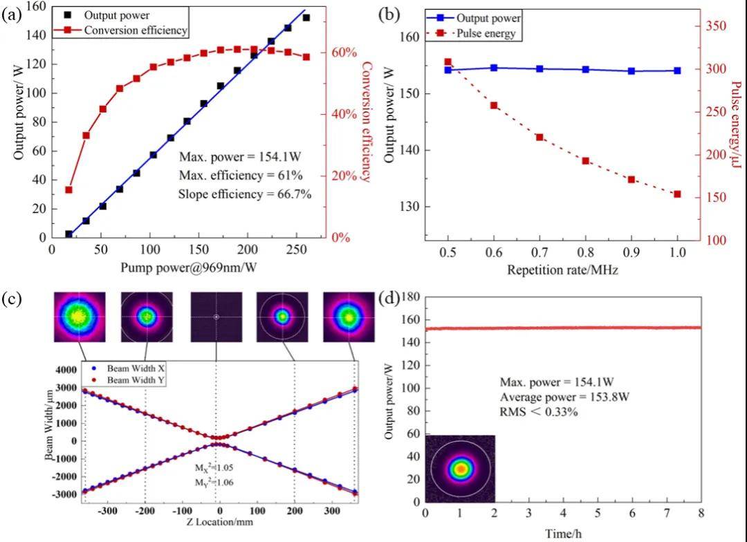 在1 MHz时,再生放大器最大输出功率为154.1 W,光-光转换效率最高可达61%,最高功率下的光束质量因子为MX2 = 1.05,MY2 = 1.06,8小时功率稳定性RMS<0.33%。