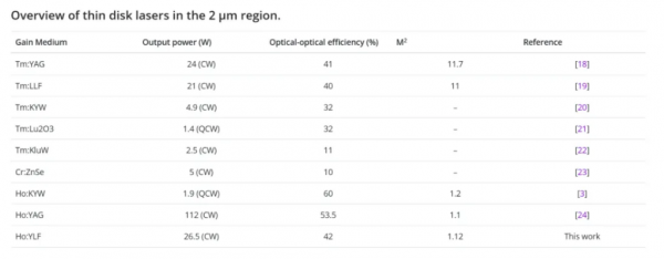 表 1:2μm 区域薄片欧陆娱乐器概览。资料来源:Bingying Lei, Liyi Zhang, Sen Yang 等人,《Near diffraction-limited in-band pumped Ho:YLF composite thin disk laser at 2 μm》,《Optics Express》(2025)。