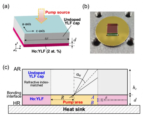 图 1:Ho:YLF 复合薄片晶体示意图。(a) Ho:YLF 复合薄片的 3D 示意图。(b) 焊接到 SiC 散热器上的 Ho:YLF 复合薄片照片。(c) Ho:YLF 复合薄片沿泵浦光传播方向的横截面图。资料来源:Bingying Lei, Liyi Zhang, Sen Yang 等人,《Near diffraction-limited in-band pumped Ho:YLF composite thin disk laser at 2 μm》,《Optics Express》(2025)。