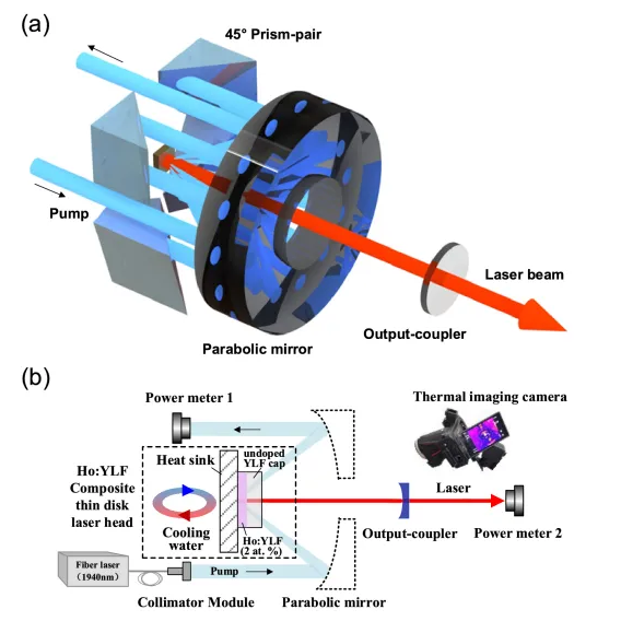 图 2:Ho:YLF 薄片欧陆娱乐器示意图。(a) 基于 12 路泵浦模块的薄片欧陆娱乐器 3D 示意图。(b) 实验装置图,显示带有水冷散热器的复合薄片欧陆娱乐头。资料来源:Bingying Lei, Liyi Zhang, Sen Yang 等人,《Near diffraction-limited in-band pumped Ho:YLF composite thin disk laser at 2 μm》,《Optics Express》(2025)。