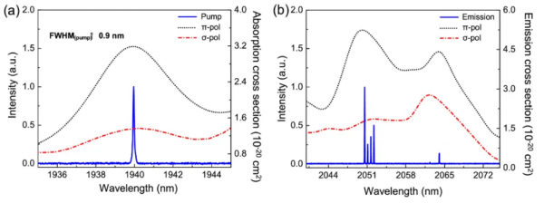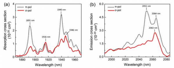 图 3:室温下 2 at.% 掺杂 Ho:YLF 晶体的吸收和发射截面。资料来源:Bingying Lei, Liyi Zhang, Sen Yang 等人,《Near diffraction-limited in-band pumped Ho:YLF composite thin disk laser at 2 μm》,《Optics Express》(2025)。