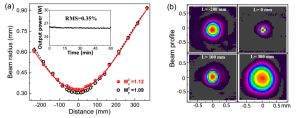 图 6:输出光束质量。(a) 26W 输出光束质量的 M2 测量。(b) 不同距离(L = -200mm、0mm、100mm 和300mm)下的光束轮廓。资料来源:Bingying Lei, Liyi Zhang, Sen Yang 等人,《Near diffraction-limited in-band pumped Ho:YLF composite thin disk laser at 2 μm》,《Optics Express》(2025)。