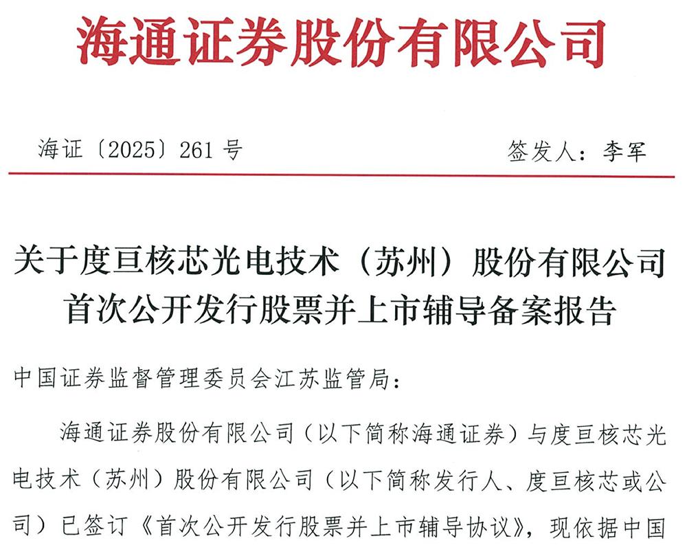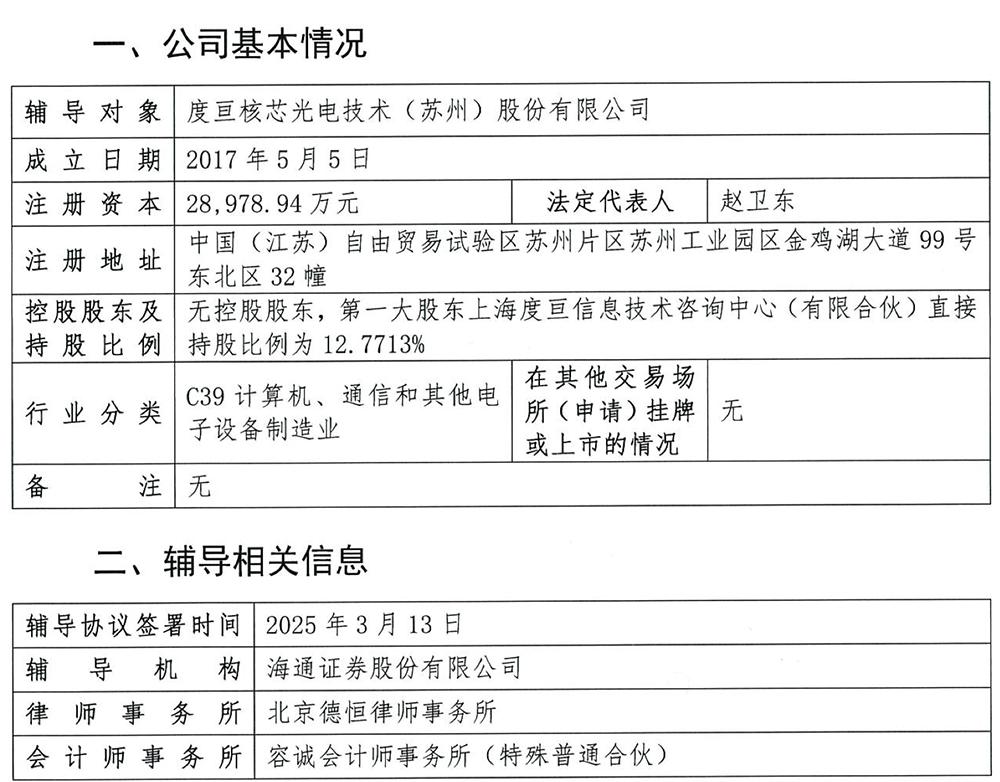 3月21日,证监会披露了海通证券关于度亘核芯光电技术(苏州)股份有限公司(简称:度亘核芯)首次公开发行股票并上市辅导备案报告。