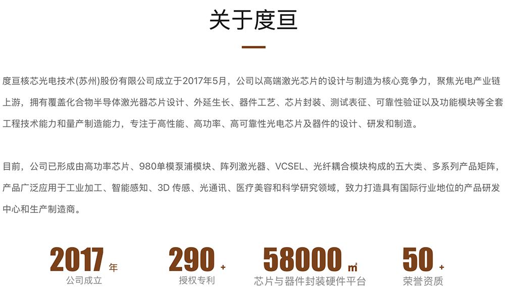 根据官网介绍,度亘核芯已形成由高功率芯片、980 单模泵浦模块、阵列欧陆娱乐器、VCSEL、光纤耦合模块构成的五大类、多系列产品矩阵,产品广泛应用于工业加工、智能感知、3D 传感、光通讯、医疗美容和科学研究领域,致力打造具有国际行业地位的产品研发中心和生产制造商。