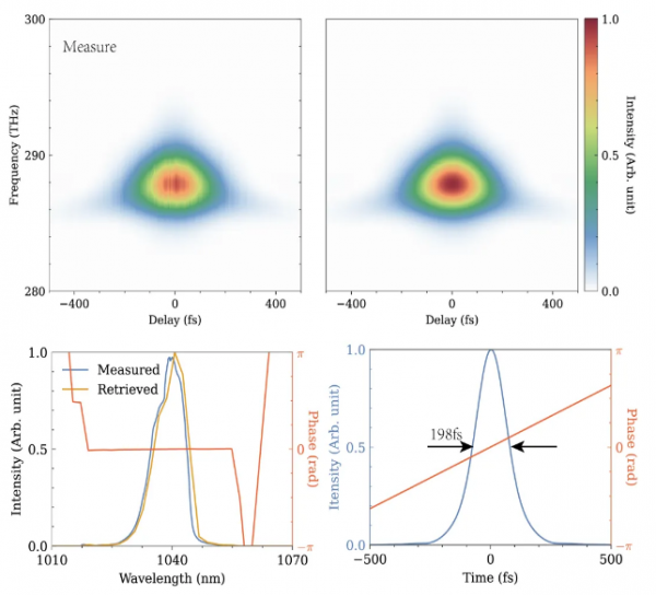 末端配置自研高色散容限脉冲压缩器,实现放大脉冲的精准去啁啾。实测压缩后脉宽为198 fs,压缩器效率80%,对应单脉冲能量8mJ,峰值功率可达40 GW。通过自研FROG对输出脉冲进行时域表征结果如图6所示