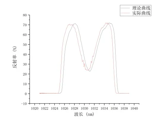 前端采用"9"字腔锁模光纤种子源,通过非线性环形镜的周期性饱和吸收效应,直接产生亚百飞秒级超短脉冲。利用非线性脉冲放大,将光谱展宽至1000–1060 nm,有效覆盖Yb:CALGO晶体的辐射带宽,显著抑制再生放大过程中的增益窄化效应。此阶段使用自研的马鞍形CFBG展宽器(Saddle-shaped CFBG),其反射谱中部凹陷设计(凹陷深度>50%)可预补偿后续放大器的光谱增益窄化效应,其中光栅谱线如图3所示。