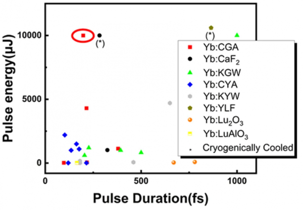图1. 不同晶体实现的再生放大装置输出脉冲能量和脉冲宽度
