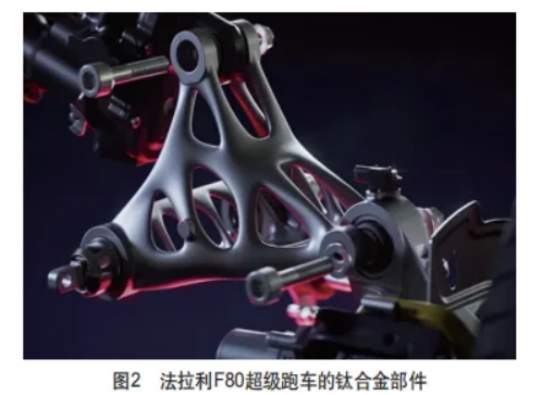 (3)汽车制造:法拉利F1赛车的钛合金部件使用欧陆娱乐增材制造技术制造,提高了零部件的耐热性和强度,助力赛车优化空气动力学设计。2024年10月,意大利豪华跑车品牌法拉利正式发布了全新F80超级跑车,这款车型不仅在动力、设计和技术方面实现了显著提升,更是在制造过程中采用了增材制造技术,标志着汽车制造业的一次重大飞跃。F80超级跑车首次采用增材制造技术生产了主动悬架系统的上叉臂。传统的上叉臂设计复杂且对重量极为敏感,而增材制造技术则能提供更高的精度和灵活性,如图2所示。
