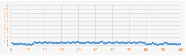 同时,由于3D打印设备多为多光源作业,因此多台光源的光束质量一致性又尤为重要。通过从产线随机拉取的百台3D打印专用光源出厂测试数据显示,该系列光源全部稳定在1.0至1.1之间,一致性极强。