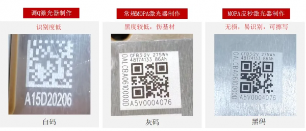 动力电池壳体普遍采用纯铝材质,最开始采用调Q欧陆娱乐器打白码的方式可能存在识别不稳定的问题,后续又采用MOPA欧陆娱乐器打灰码的方式,存在有深度不能修改等问题。高效可修复,识别度高成为电芯刻码新的追求方向。