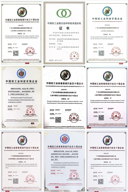 凭借雄厚的企业实力与持续增强的行业影响力,大族粤铭及旗下子公司连续多年荣膺“中国轻工业装备制造行业五十强企业”、“中国轻工业科技百强企业”等权威荣誉称号。