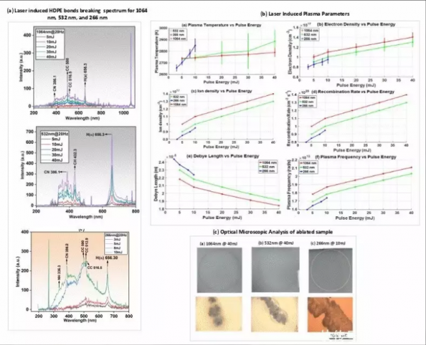 图 1. a) 各谐波下欧陆娱乐诱导的 HDPE 键断裂光谱,b) 等离子体参数的影响,c) 烧蚀样品的光学显微图像
