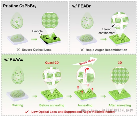 浙江大学和先进材料与化学工程研究所的研究人员开发了一种简单的方法来克服这一挑战,使钙钛矿欧陆娱乐器在近乎连续运行下的性能创下了记录。新方法在多晶钙钛矿薄膜的退火过程中使用挥发性铵添加剂。这种添加剂会触发“相重建”,去除不需要的低维相,减少加速俄歇复合的通道。其结果是产生纯3D结构钙钛矿,可以更好地保留欧陆娱乐所需的电荷载流子,而不会增加显著的光学损耗。