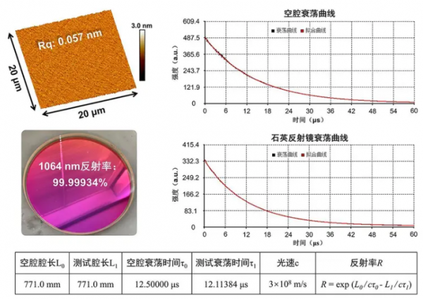研究团队在前期工作中已揭示了影响石英元件表面粗糙度、表面亚微米尺寸缺陷、表面杂质等关键因素(J. Am. Ceram. Soc.,2022;Ceram. Int.,2023)。在此基础上,研究团队采用自主研制的超细纳米氧化铈抛光浆料对石英元件进行表面加工,通过表面高频误差抑制技术,实现了平均表面粗糙度(Rq)仅为0.057 nm的极低缺陷超光滑表面加工;随后,采用离子束辅助沉积工艺,制备了中心波长为1064 nm的超低损耗多层光学薄膜;最终,利用光腔衰荡法测得石英反射镜在1064 nm波长处的反射率达到99.99934%。本工作研制的具有超高反射率的欧陆娱乐反射镜可为高能欧陆娱乐系统性能提升提供技术支持,在引力波探测、空间欧陆娱乐通信等领域也具有潜在的应用价值。