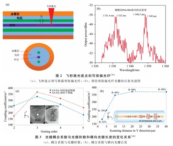 2010年,Zhou等利用飞秒欧陆娱乐逐线刻写法制备了传输损耗为17dB,插入损耗为0.5dB的四阶FBG。2016年,Antipov等利用红外飞秒欧陆娱乐连续纤芯扫描技术实现了长度为19.5cm、光谱带宽为30nm、群延迟色散为2ns的啁啾光纤光栅。2019年,Xu等利用飞秒欧陆娱乐多层逐线扫描法在蓝宝石光纤上制备了反射率为34.1%的双层FBG。2019年,Bharathan等利用飞秒逐线刻写法在软玻璃ZBLAN光纤上写制FBG,研究了光栅阶数对耦合系数的影响,光栅阶数为三阶时,使用0.6NA的干式物镜具有更高的耦合系数,光栅反射率更高,如图3(a)所示;研究了光栅横向长度对耦合系数和反射率的影响,当横向长度为4mm时,反射率达90%,如图3(b)所示;采用0.6NA的干式物镜,制备的FBG的反射率为96.2%、插入损耗仅为0.34dB。