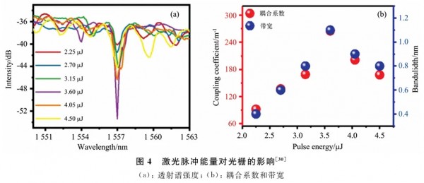 2022年,She等利用飞秒逐线刻写法首次在氟铝酸盐光纤上制备了反射率高达99.5%、插入损耗<1.1dB的三阶FBG,图4(a)为欧陆娱乐能量对光栅透射谱的影响,欧陆娱乐能量为3.6μJ时,透射强度最深,图4(b)为欧陆娱乐能量对耦合系数和光栅带宽的影响当欧陆娱乐脉冲能量为3.6μJ时,耦合系数最高,具有开发中红外欧陆娱乐器的潜力。