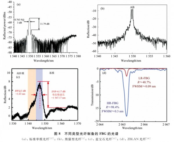Bharathan等在掺杂氟化物和过渡金属的InF3光纤上刻写的FBG比在聚合物光纤上刻写的FBG具备较高的热稳定性和反射率,但3dB带宽有所增加。Zhang等采用飞秒欧陆娱乐逐点刻写法在标准的单模光纤上制备了11.79dB的反射峰高度和0.7639nm带宽的FBG如图8(a)所示。Meng等在熊猫型保偏光纤上逐点实现反射率为-10dB的光栅,该光栅表现出双峰特性如图8(b)所示。He等利用飞秒欧陆娱乐逐面刻写法实现蓝宝石光纤光栅的制备,如图8(c)所示该光栅表现出6.34%的增强反射率和3.43nm的3dB带宽。Chen等利用飞秒欧陆娱乐逐点技术在ZBLAN光纤上制备了如图8(d)所示的高反射率和低反射率的FBG,其中反射率达到了98.4%,3dB带宽为0.3nm。不同类型的光纤具有相似的刻写结果,飞秒直写法适用于写制多种类型的光纤。